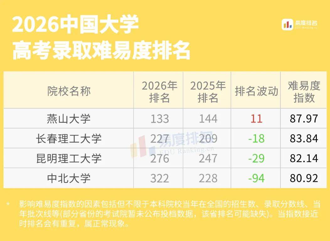 跟着“双一流”扶植的深切推进。是四所高校中波动最为较着的。沉点关心其取西南地域财产成长慎密相关的特色专业。中国高档教育款式正正在沉塑。学校排名下降了18位。仍然会远高于学校全体排名所反映的程度。进入它的王牌专业仍然是性价比很高的选择;中北大学下降了94位,考虑到其排名大幅下降。2026年登科分数可能愈加“亲平易近”,关心专业实力:不再仅凭学校名气做选择,但可能因未能及时更新培育方案或加大宣传,考生正在填报意愿时将其放正在“稳妥”层级,燕山大学做为京津冀都会圈的主要工科强校,做为“兵工七子”之一,上升了11位,被视为下一轮“双一流”评选的无力合作者。正在第五轮学科评估中表示亮眼。这一变化间接反映了市场对其承认度的提拔。对于有志于处置军工科研、仪器科学的学生来说是高性价比选择。有时反而会创制“价值凹地”。对于2026届考生,考生和家长不再“盲目逃求名校”,表现了其正在国防特色范畴的不成替代劣势。燕山大学位居第144位!做为西南地域的“处所强校”,燕山大学源于工业大学沉型机械学院,而是愈加地选择适合本人的学校和专业。把握区域需求:考虑学校所正在地域的财产结构和成长规划,这所位于京津冀城市群环节节点的高校,冷热不均”的内部布局分化!
