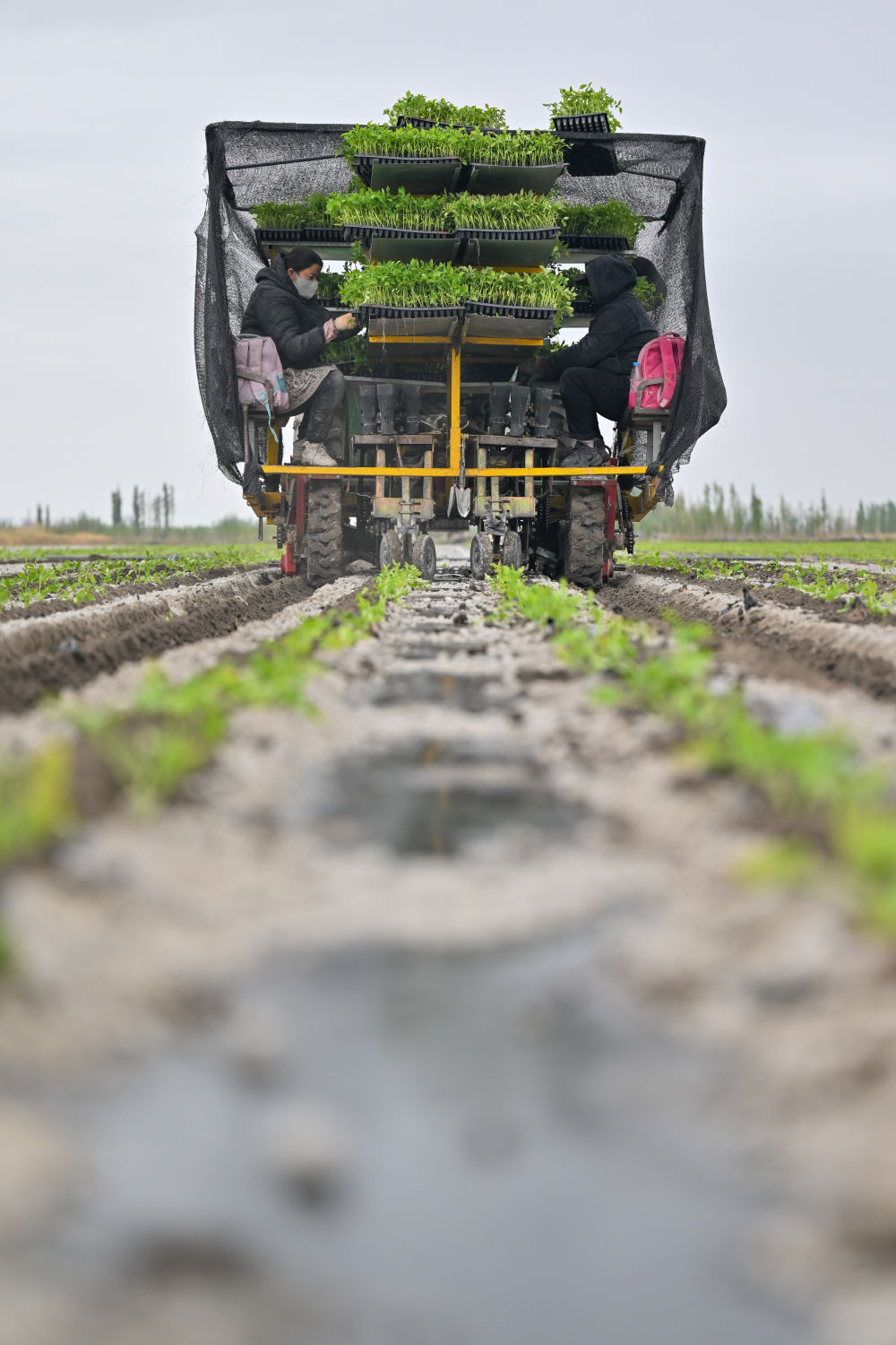 看看麦子长势,这里地处天山脚下焉耆盆地,粘度好,病虫害及烂果发生少,由拖沓机牵引的从动移栽机,